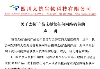 關(guān)于太抗?產(chǎn)品未授權(quán)任何網(wǎng)絡(luò)銷售的聲明發(fā)布日期:2017.05.15點(diǎn)擊量:6559
