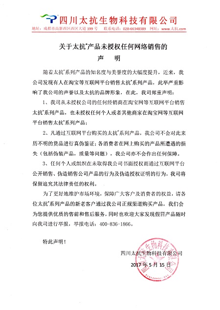 關(guān)于太抗?產(chǎn)品未授權(quán)任何網(wǎng)絡(luò)銷(xiāo)售的聲明