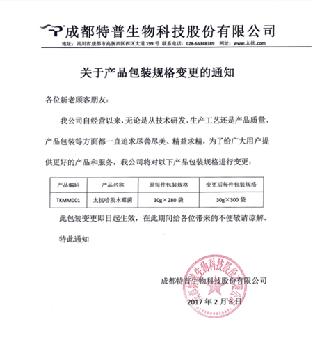 本著精益求精的工匠精神,以提高客戶滿意度為宗旨,同時(shí)根據(jù)市場(chǎng)需求、客戶反饋以及公司的發(fā)展需求,2月8日,公司給市場(chǎng)上各位新老客戶發(fā)出了關(guān)于太抗?哈茨木霉菌包裝變更的通知,公司生產(chǎn)部的同事們也正加班加點(diǎn)生產(chǎn),希望趕在春播前把產(chǎn)品配送到各位客戶朋友手上!