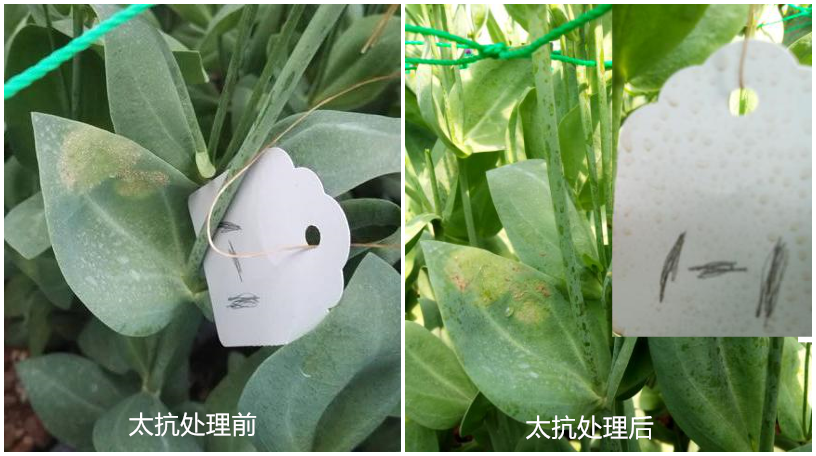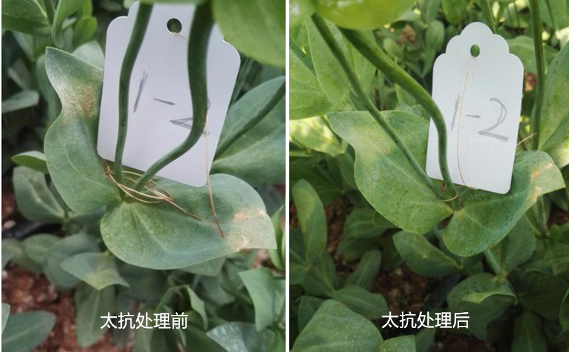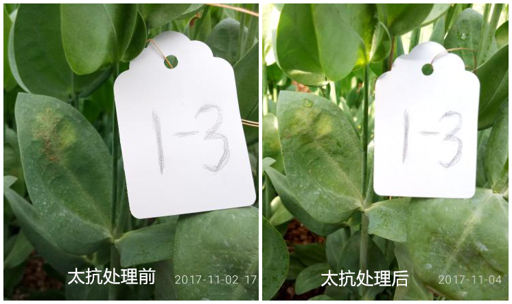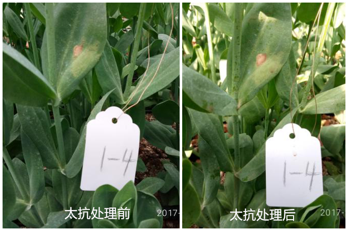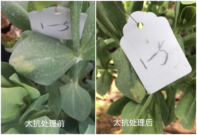 試驗(yàn)結(jié)果:太抗幾?。久快`能有效防治洋桔?;颐共。够疑箤幼兏擅撀?。對(duì)照組仍有部分病斑沒有得到有效控制。