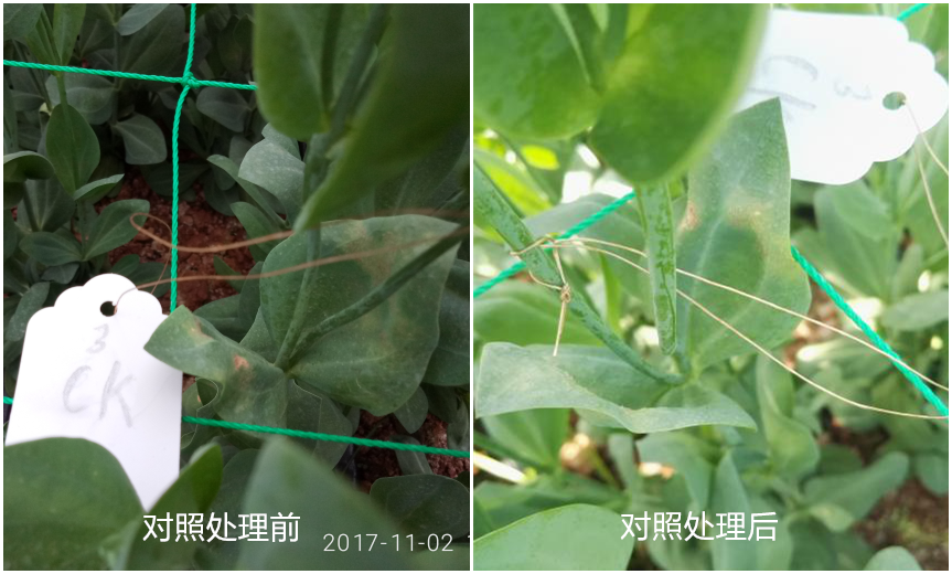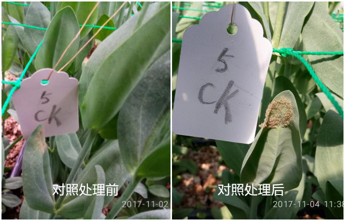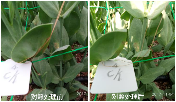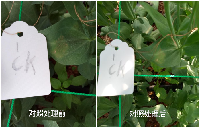 對(duì)照區(qū)經(jīng)過兩次觀察,病害控制情況不理想,依舊有部分霉層活躍未脫落。